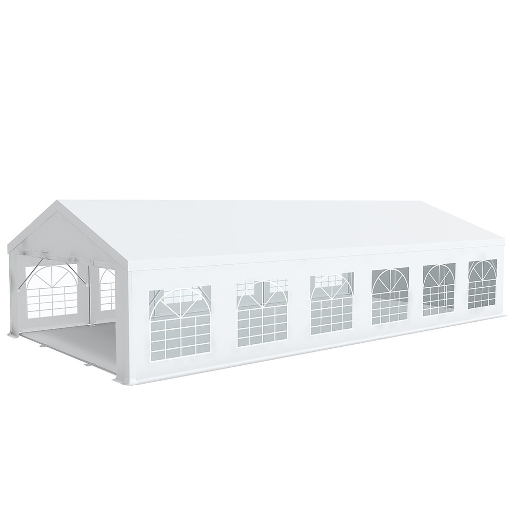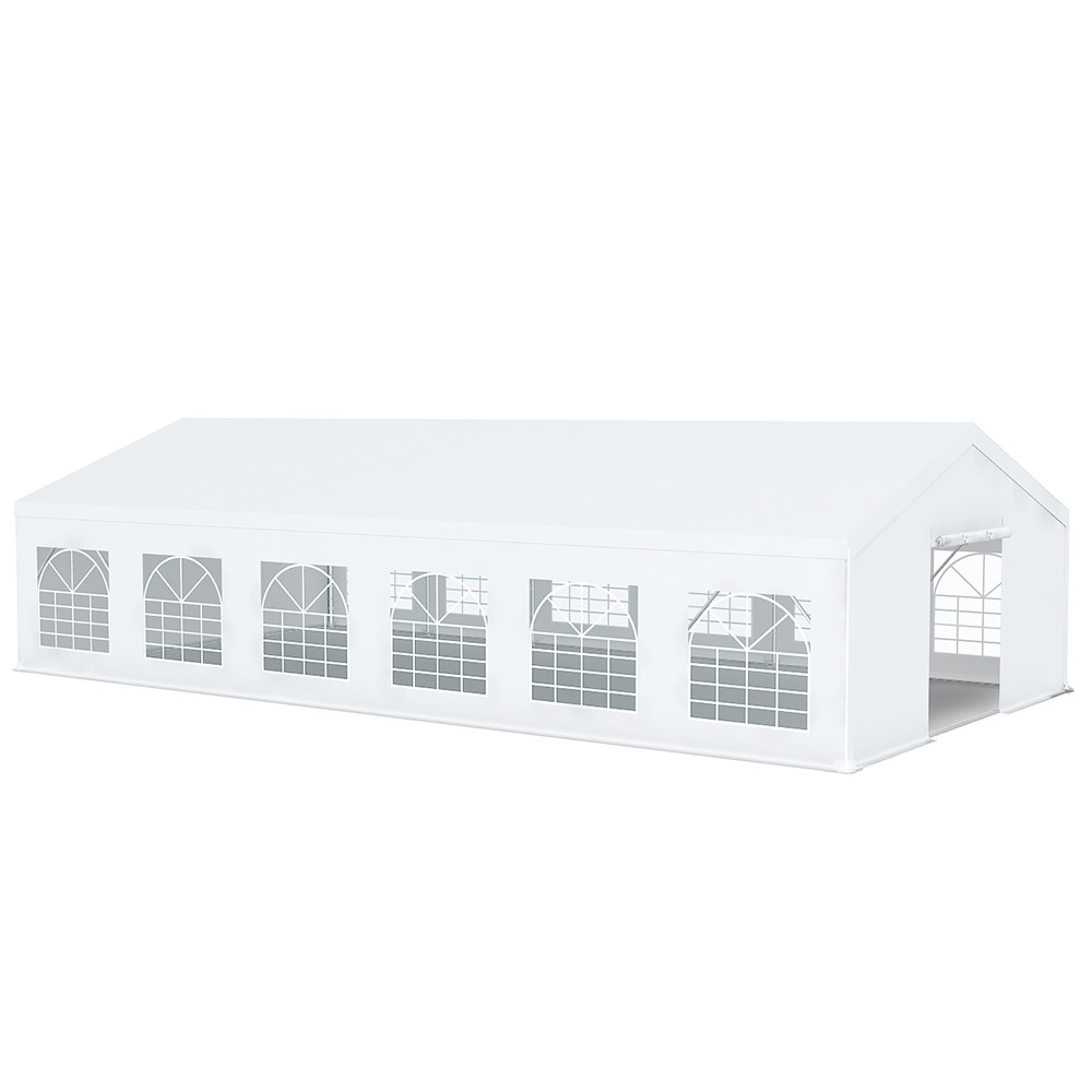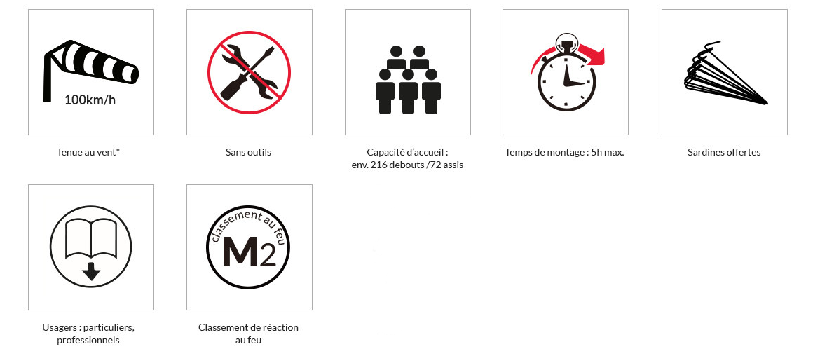 Toutes les bâches de cette tente sont 100% en PVC, similaire à de la bâche camion, avec un grammage de 520g/m². Elles sont toutes imperméables grâce à leur couture thermosoudée. Les pignons et les bâches latérales peuvent être entièrement ou partiellement enlevées si besoin. Chaque bâche de côté dispose d'un surplus de 15cm avec œillets permettant de fixer au sol au moyen de sardines afin d'avoir une meilleure protection contre le vent et la pluie. Les bâches ont reçu le classement au feu M2 (difficilement inflammable). Tous les oeillets sont en inox évitant ainsi tout risque de rouille.