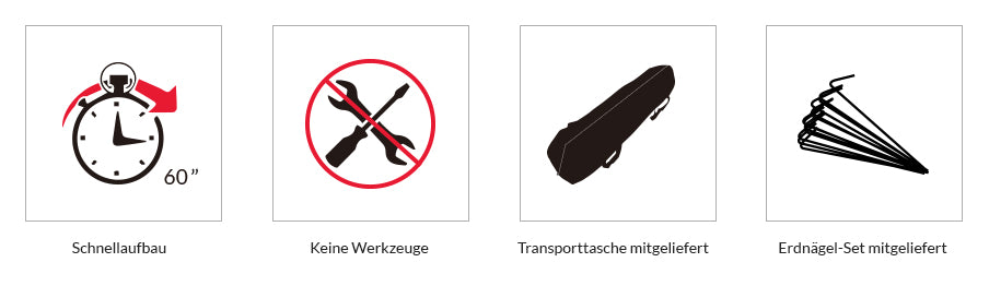 La tente pliante est fournie avec sa housse de transport à roulettes pour faciliter les déplacements et un kit d’arrimage (sardines et cordes) pour haubaner la structure au sol.