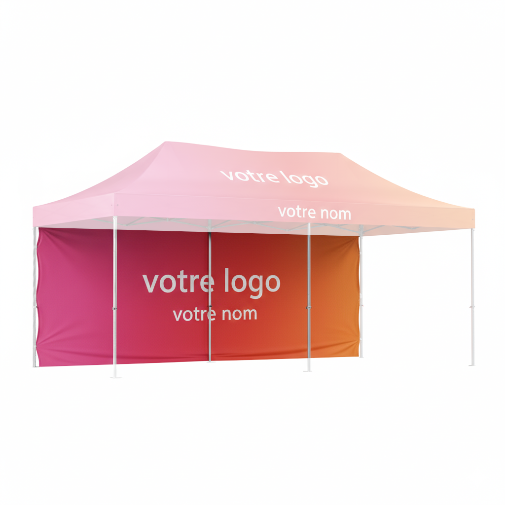 Toute la face de la bâche est personnalisable avec votre logo, votre nom, vos coordonnées, votre slogan, vos partenaires ou sponsors, des photos de vos produits, les valeurs de votre organisme et ses qualités... Le procédé d'impression numérique conserve l'imperméabilité de la bâche. Par défaut c'est la face extérieure de la bâche est personnalisée (personnalisation à l'extérieur de la tente pliante) et la face intérieure de la bâche est blanche (face à l'intérieur de la tente).
