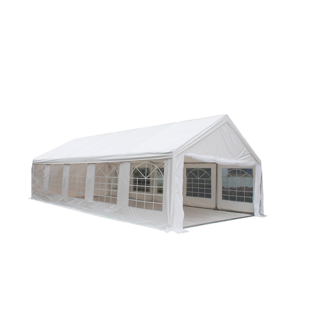 Toutes les bâches de cette tente sont 100% en PVC, similaire à de la bâche camion, avec un grammage de 500g/m² ou de 520g/m². Elles sont toutes imperméables grâce à leurs coutures thermosoudées. Les pignons et les bâches latérales peuvent être entièrement ou partiellement enlevés si besoin. Chaque bâche de côté dispose d'un surplus de 15cm avec œillets permettant de fixer au sol au moyen de sardines afin d'avoir une meilleure protection contre le vent et la pluie. Les bâches ont reçu le classement au feu M2 (difficilement inflammable).