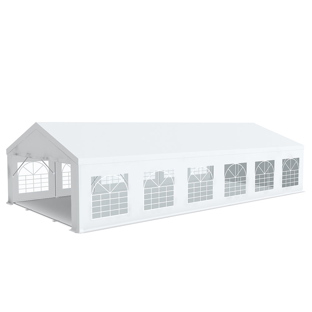 Toutes les bâches de cette tente sont 100% en PVC, similaire à de la bâche camion, avec un grammage de 520g/m². Elles sont toutes imperméables grâce à leurs coutures thermosoudées. Les pignons et les bâches latérales peuvent être entièrement ou partiellement enlevés si besoin. Chaque bâche de côté dispose d'un surplus de 15cm avec œillets permettant de fixer au sol au moyen de sardines afin d'avoir une meilleure protection contre le vent et la pluie. Les bâches ont reçu le classement au feu M2 (difficilement inflammable).