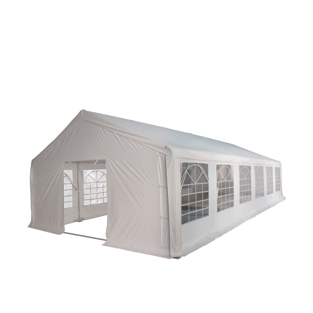 La structure tubulaire du barnum 8x12m est entièrement en acier galvanisé à chaud afin de la protéger de la corrosion. Les quatre pieds d'angles ainsi que deux pieds intermédiaires sont en tubes de 76mm de diamètre et les autres pieds intermédiaires sont en tubes de 50mm de diamètre. L’assemblage des éléments de structure se fait entièrement par vis écrou et vis papillon ce qui améliore la rigidité de l'ossature. Tout est réuni au niveau de la structure pour maximiser la stabilité et la résistance au vent: des tubes transversaux ainsi que des doubles câbles de maintien du toit notamment en cas de pluie/neige, 4 bracons de contreventement, des barres de renfort au sol au niveau des portes et sur les côtés, barres de renfort sous faîtage, 8 barres de contreventement et des câbles latéraux afin de maintenir l'écartement pour une meilleure stabilité et une meilleure tenue. La structure doit être haubanée en toute circonstance.